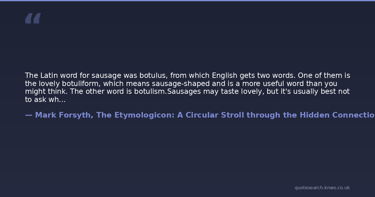 The Latin word for sausage was botulus, from which English gets two words. One of them is the lovely botuliform, which means sausage-shaped and is a more useful word than you might think. The other word is botulism.Sausages may taste lovely, but it's usually best not to ask what's actually in them. Curiosity may have killed the cat, but it was a sausage-maker who disposed of the body.