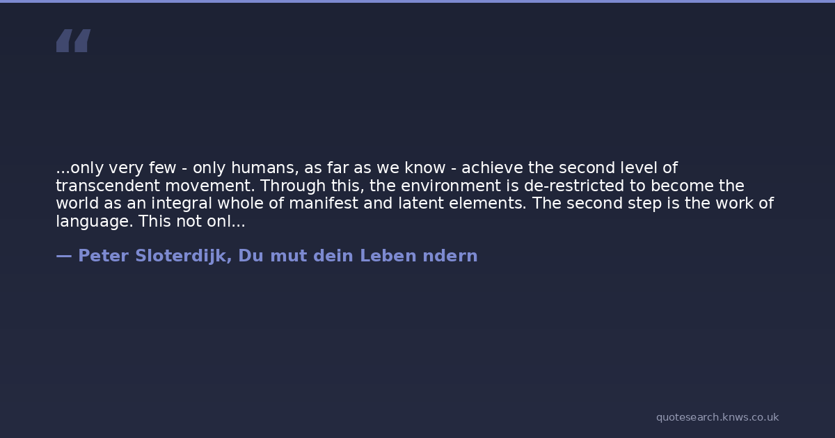 ...only very few - only humans, as far as we know - achieve the second level of transcendent movement. Through this, the environment is de-restricted to become the world as an integral whole of manifest and latent elements. The second step is the work of language. This not only builds the 'house of being' - Heidegger took this phrase from Zarathustra's animals, which inform the convalescent: 'the house of being rebuilds itself eternally'; it is also the vehicle for the tendencies to run away from that house with which, by means of its inner surpluses, humans move towards the open. It need hardly be explained why the oldest parasite in the world, the world above, only appears with the second transcendence.