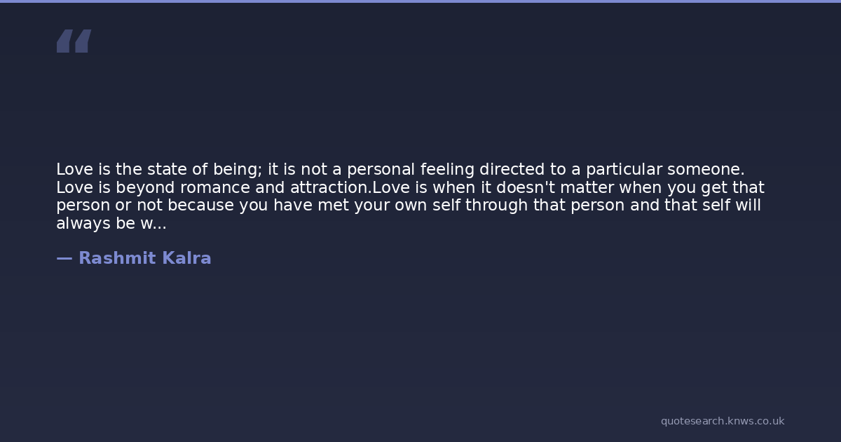 Love is the state of being; it is not a personal feeling directed to a particular someone. Love is beyond romance and attraction.Love is when it doesn't matter when you get that person or not because you have met your own self through that person and that self will always be with you....within you.Love is not your loftiest fantasy you always thought will happen to you. Love is not wanting someone at any cost and cursing them if you do not "get" them. Love is who you are - your very essence felt and experienced by all that come into your vicinity