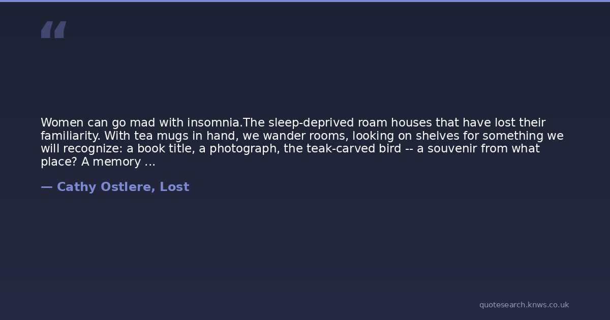 Women can go mad with insomnia.The sleep-deprived roam houses that have lost their familiarity. With tea mugs in hand, we wander rooms, looking on shelves for something we will recognize: a book title, a photograph, the teak-carved bird -- a souvenir from what place? A memory almost rises when our eyes rest on a painting's grey sweep of cloud, or the curve of a wooden leg in a corner. Fingertips faintly recall the raised pattern on a chair cushion, but we wonder how these things have come to be here, in this stranger's home.Lost women drift in places where time has collapsed. We look into our thoughts and hearts for what has been forgotten, for what has gone missing. What did we once care about? Whom did we love? We are emptied. We are remote. Like night lilies, we open in the dark, breathe in the shadowy world. Our soliloquies are heard by no one.