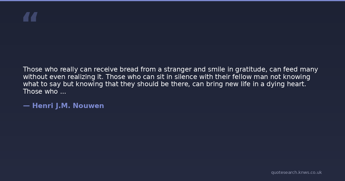 Those who really can receive bread from a stranger and smile in gratitude, can feed many without even realizing it. Those who can sit in silence with their fellow man not knowing what to say but knowing that they should be there, can bring new life in a dying heart. Those who are not afraid to hold a hand in gratitude, to shed tears in grief, and to let a sigh of distress arise straight from the heart, can break through paralyzing boundaries and witness the birth of a new fellowship, the fellowship of the broken.