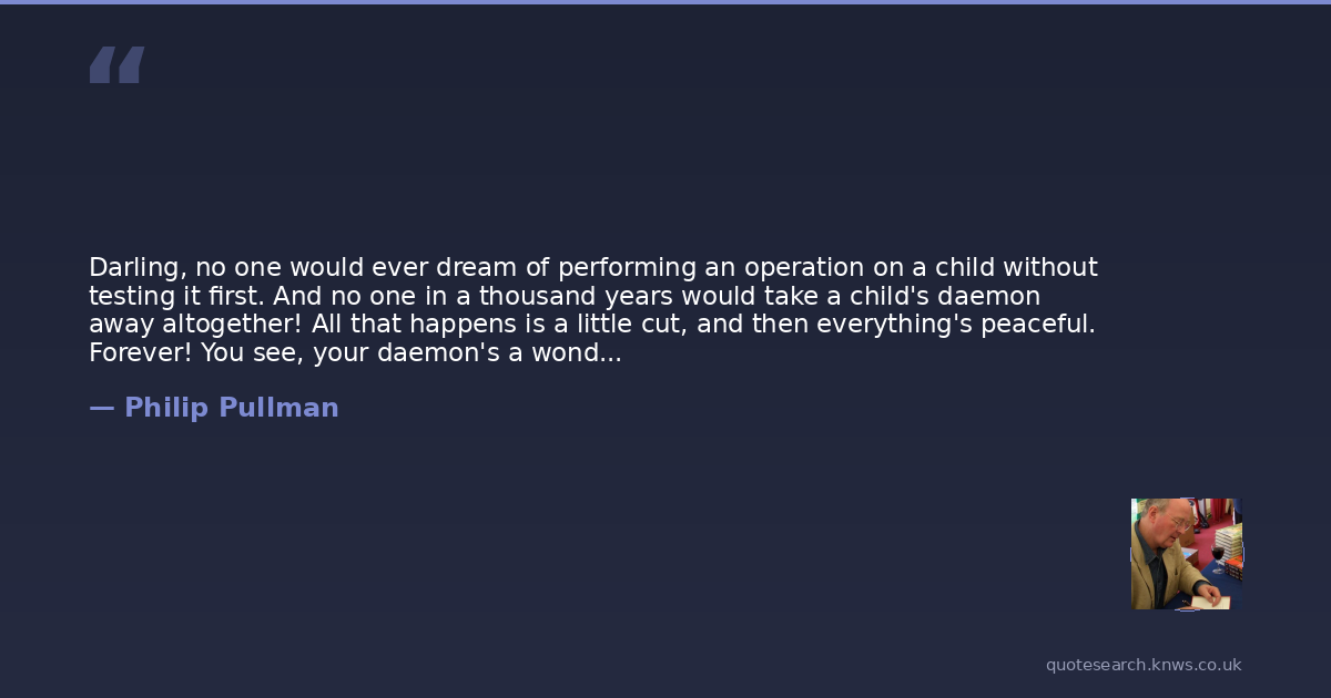 Darling, no one would ever dream of performing an operation on a child without testing it first. And no one in a thousand years would take a child's daemon away altogether! All that happens is a little cut, and then everything's peaceful. Forever! You see, your daemon's a wonderful friend and com panion when you're young, but at the age we call puberty, the age you're coming to very soon, darling, daemons bring all sort of troublesome thoughts and feelings, and that's what lets Dust in. A quick little operation before that, and you're never troubled again. And your daemon stays with you, only...just not connected. Like a... like a wonderful pet, if you like. The best pet in the world!Wouldn't you like that? (Marisa Coulter)