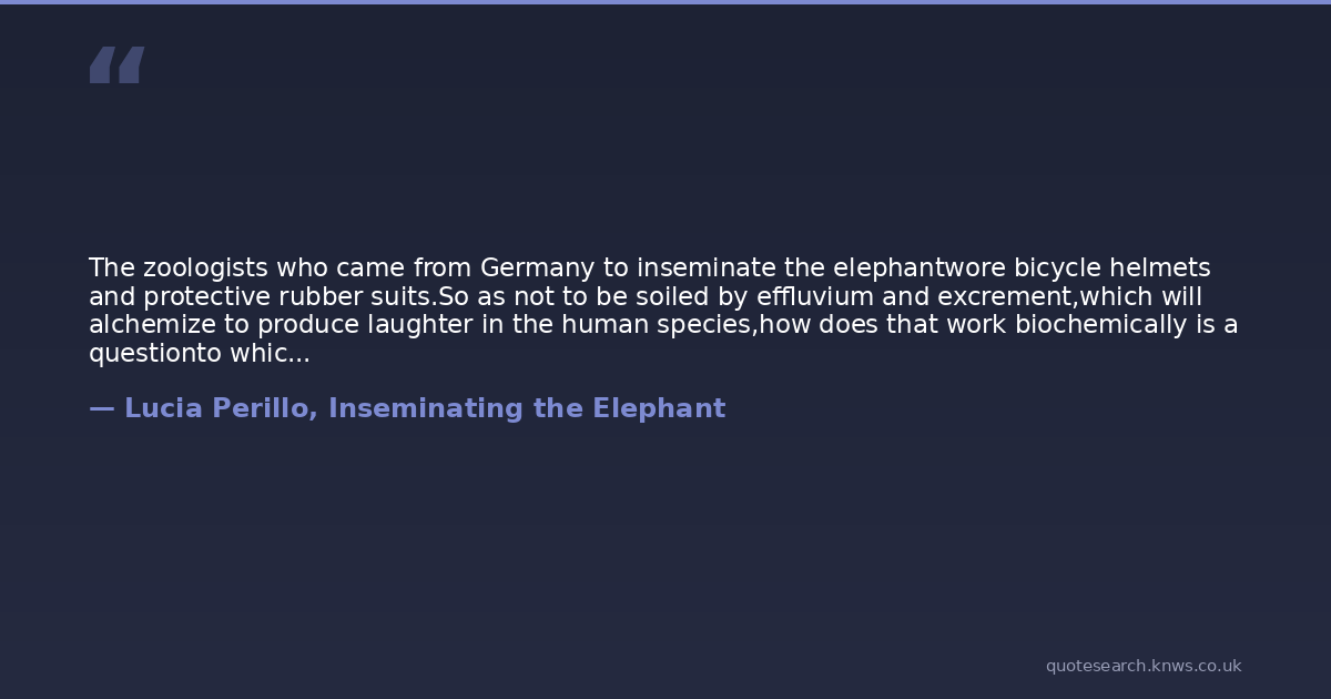 The zoologists who came from Germany to inseminate the elephantwore bicycle helmets and protective rubber suits.So as not to be soiled by effluvium and excrement,which will alchemize to produce laughter in the human species,how does that work biochemically is a questionto which I have not found an answer yet.