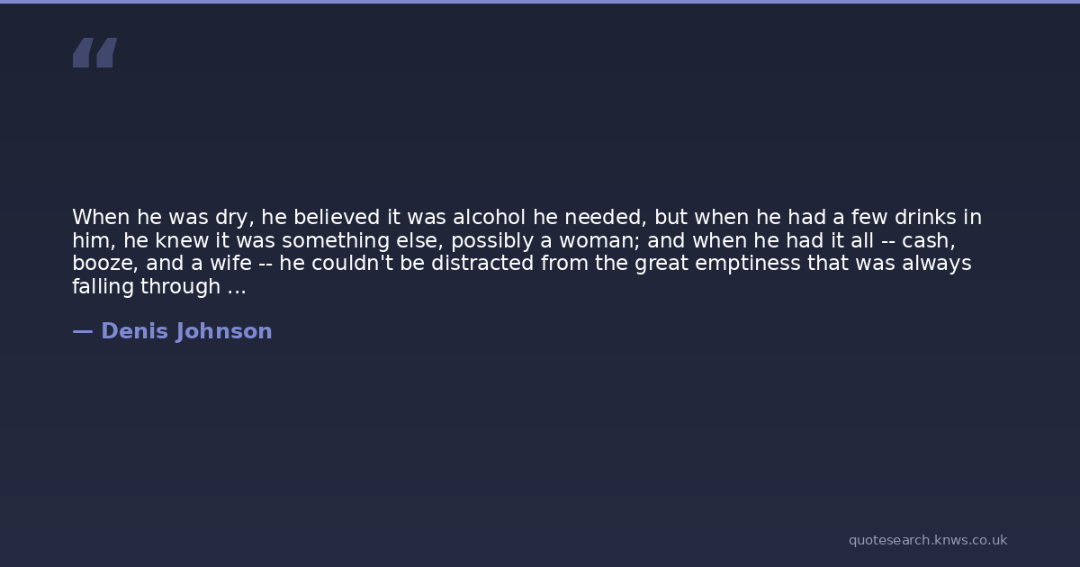 When he was dry, he believed it was alcohol he needed, but when he had a few drinks in him, he knew it was something else, possibly a woman; and when he had it all -- cash, booze, and a wife -- he couldn't be distracted from the great emptiness that was always falling through him and never hit the ground.