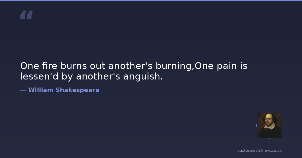 One fire burns out another's burning,One pain is lessen'd by another's anguish.