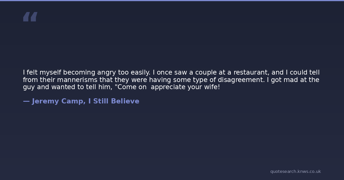 I felt myself becoming angry too easily. I once saw a couple at a restaurant, and I could tell from their mannerisms that they were having some type of disagreement. I got mad at the guy and wanted to tell him, "Come on appreciate your wife!