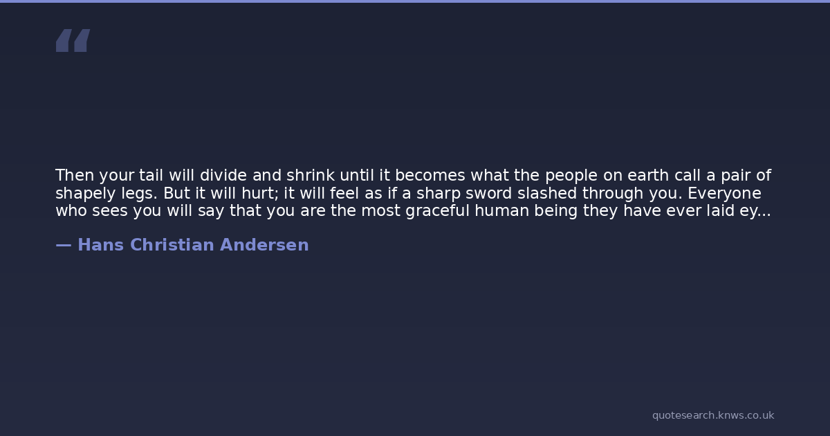 Then your tail will divide and shrink until it becomes what the people on earth call a pair of shapely legs. But it will hurt; it will feel as if a sharp sword slashed through you. Everyone who sees you will say that you are the most graceful human being they have ever laid eyes on, for you will keep your gliding movement and no dancer will be able to tread as lightly as you. But every step you take will feel as if you were treading upon knife blades so sharp that blood must flow. I am willing to help you, but are you willing to suffer all this?""Yes," the little mermaid said in a trembling voice, as she thought of the Prince and of gaining a human soul.