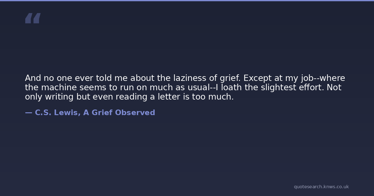 And no one ever told me about the laziness of grief. Except at my job--where the machine seems to run on much as usual--I loath the slightest effort. Not only writing but even reading a letter is too much.
