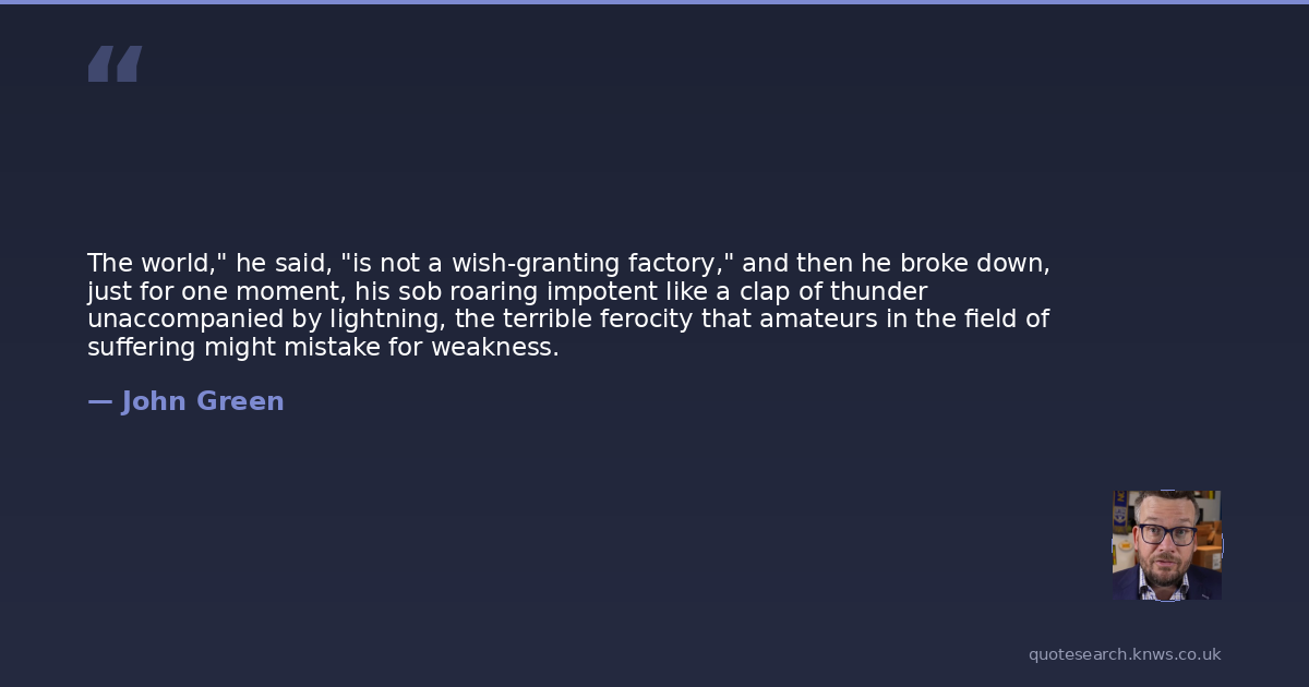 The world," he said, "is not a wish-granting factory," and then he broke down, just for one moment, his sob roaring impotent like a clap of thunder unaccompanied by lightning, the terrible ferocity that amateurs in the field of suffering might mistake for weakness.