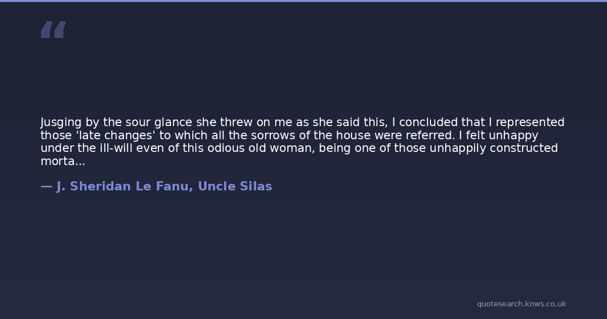 Jusging by the sour glance she threw on me as she said this, I concluded that I represented those 'late changes' to which all the sorrows of the house were referred. I felt unhappy under the ill-will even of this odious old woman, being one of those unhappily constructed mortals who cannot be indifferent when they reasonably ought, and always yearn after kindness, even that of the worthless.