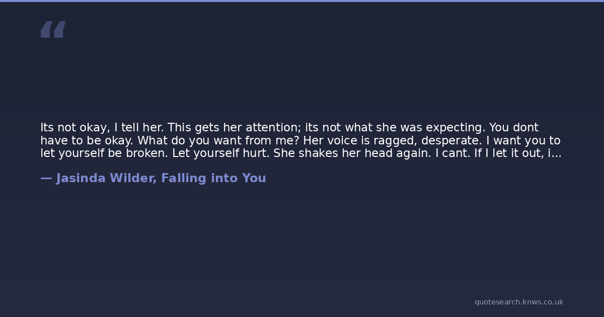 Its not okay, I tell her. This gets her attention; its not what she was expecting. You dont have to be okay. What do you want from me? Her voice is ragged, desperate. I want you to let yourself be broken. Let yourself hurt. She shakes her head again. I cant. If I let it out, itll never stop. Yes, it will.