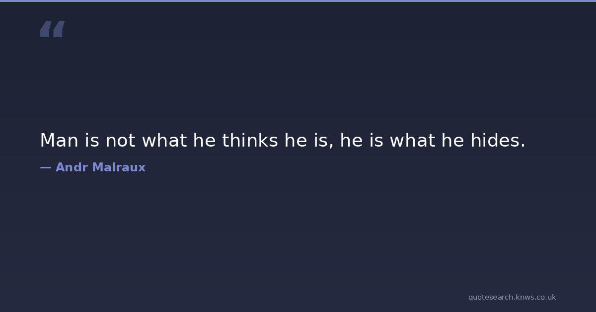 Man is not what he thinks he is, he is what he hides. deception hiding lies man secrets self-awareness Download Image Share on X Share on Facebook Copy Link