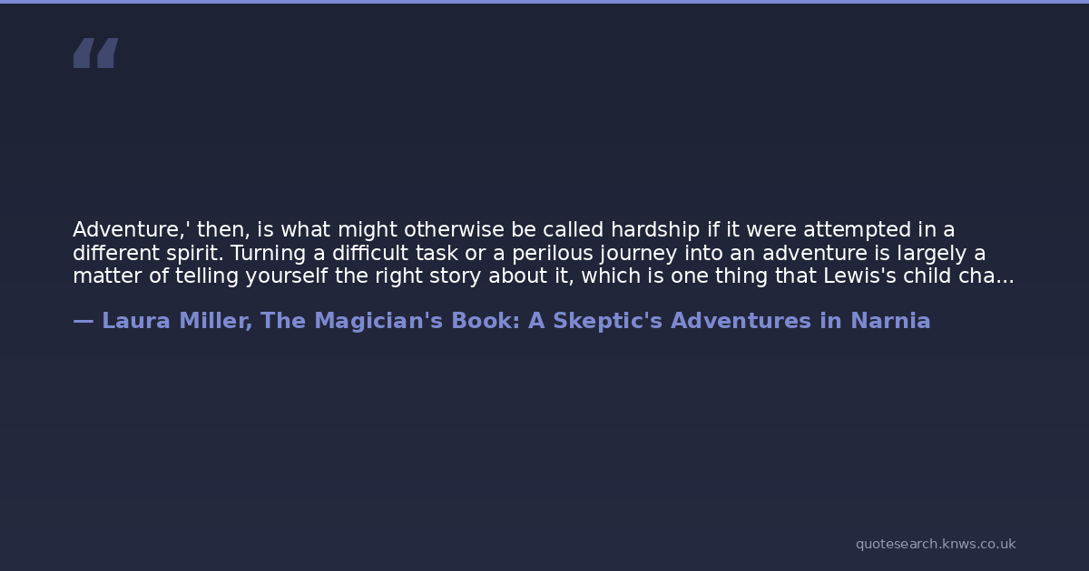 Adventure,' then, is what might otherwise be called hardship if it were attempted in a different spirit. Turning a difficult task or a perilous journey into an adventure is largely a matter of telling yourself the right story about it, which is one thing that Lewis's child characters have learned from reading, 'the right books.