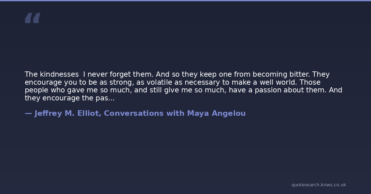 The kindnesses I never forget them. And so they keep one from becoming bitter. They encourage you to be as strong, as volatile as necessary to make a well world. Those people who gave me so much, and still give me so much, have a passion about them. And they encourage the passion in me. Im very blessed that I have a healthy temper. I can become quite angry and burning in anger, but I have never been bitter. Bitterness is a corrosive, terrible acid. It just eats you and makes you sick.