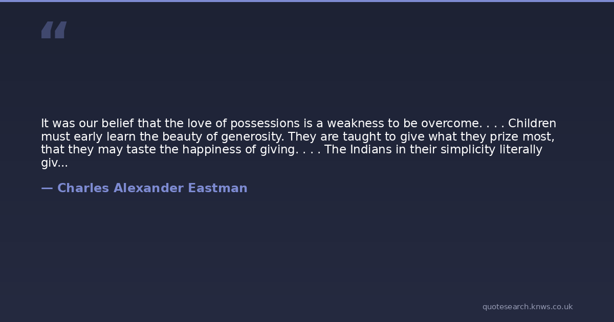 It was our belief that the love of possessions is a weakness to be overcome. . . . Children must early learn the beauty of generosity. They are taught to give what they prize most, that they may taste the happiness of giving. . . . The Indians in their simplicity literally give away all that they haveto relatives, to guests of other tribes or clans, but above all to the poor and the aged, from whom they can hope for no return.