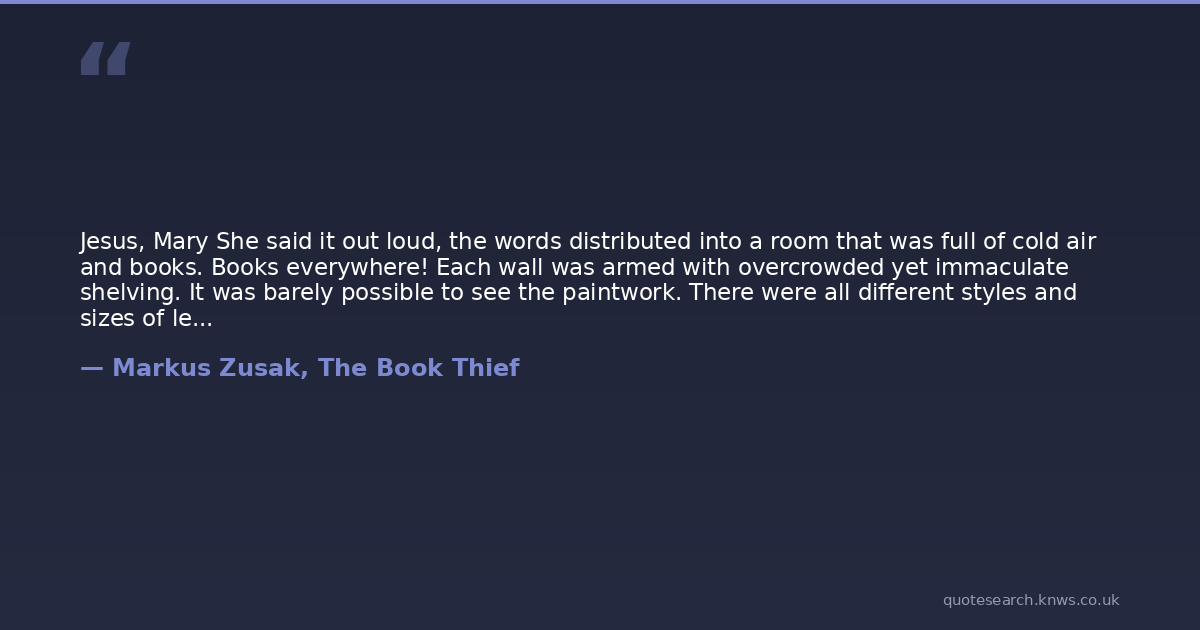 Jesus, Mary She said it out loud, the words distributed into a room that was full of cold air and books. Books everywhere! Each wall was armed with overcrowded yet immaculate shelving. It was barely possible to see the paintwork. There were all different styles and sizes of lettering on the spines of the black, the red, the gray, the every-colored books. It was one of the most beautiful things Liesel Meminger had ever seen.With wonder, she smiled.That such a room existed!Even when she tried to wipe the smile away with her forearm, she realized instantly that it was a pointless exercise. She could feel the eyes of the woman traveling her body, and when she looked at her, they had rested on her face.There was more silence than she ever thought possible. It extended like an elastic, dying to break. The girl broke it.Can I?The two words stood among acres and acres of vacant, wooden-floored land. The books were miles away.The woman nodded.Yes, you can