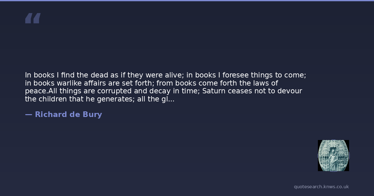 In books I find the dead as if they were alive; in books I foresee things to come; in books warlike affairs are set forth; from books come forth the laws of peace.All things are corrupted and decay in time; Saturn ceases not to devour the children that he generates; all the glory of the world would be buried in oblivion, unless God had provided mortals with the remedy of books.