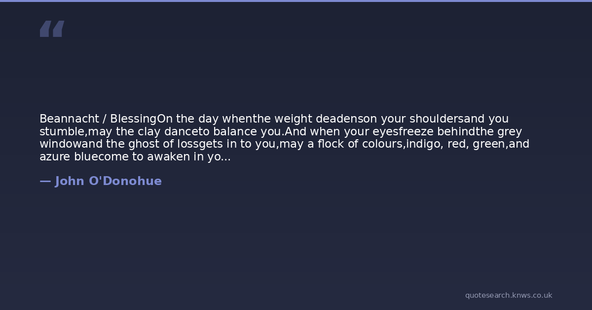 Beannacht / BlessingOn the day whenthe weight deadenson your shouldersand you stumble,may the clay danceto balance you.And when your eyesfreeze behindthe grey windowand the ghost of lossgets in to you,may a flock of colours,indigo, red, green,and azure bluecome to awaken in youa meadow of delight.When the canvas fraysin the currach of thoughtand a stain of oceanblackens beneath you,may there come across the watersa path of yellow moonlightto bring you safely home.May the nourishment of the earth be yours,may the clarity of light be yours,may the fluency of the ocean be yours,may the protection of the ancestors be yours.And so may a slowwind work these wordsof love around you,an invisible cloakto mind your life.
