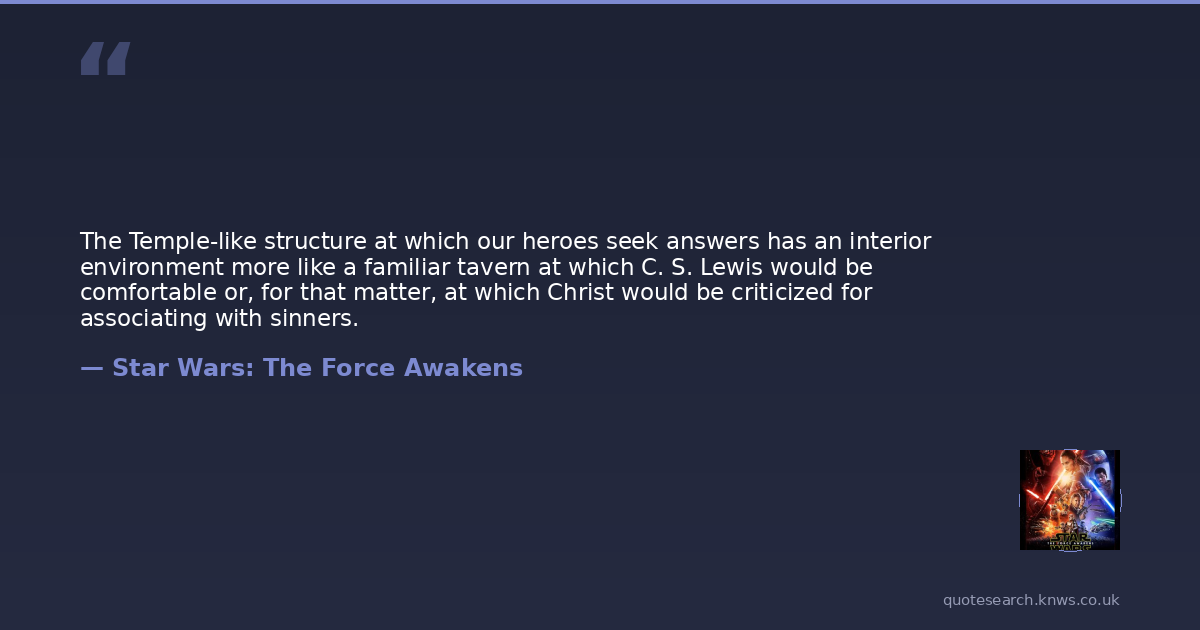 The Temple-like structure at which our heroes seek answers has an interior environment more like a familiar tavern at which C. S. Lewis would be comfortable or, for that matter, at which Christ would be criticized for associating with sinners.