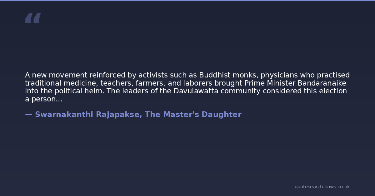 A new movement reinforced by activists such as Buddhist monks, physicians who practised traditional medicine, teachers, farmers, and laborers brought Prime Minister Bandaranaike into the political helm. The leaders of the Davulawatta community considered this election a personal achievement. They saw this as a people's government and appreciated its genuine interest in fulfilling the needs of the common people. They trusted that the present government would eradicate poverty and the caste discrimination, and work to promote self-esteem.