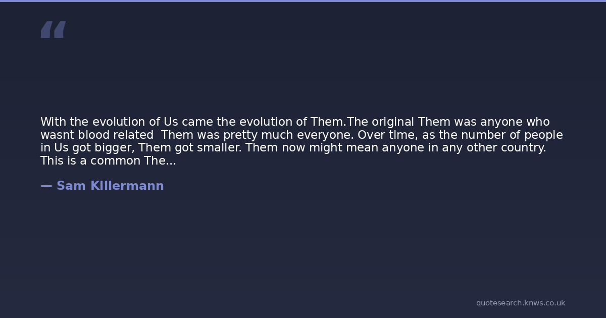 With the evolution of Us came the evolution of Them.The original Them was anyone who wasnt blood related Them was pretty much everyone. Over time, as the number of people in Us got bigger, Them got smaller. Them now might mean anyone in any other country. This is a common Them in America, and a Them that only (light use of this word) consists of 95% of the world. Another common Them in America is anyone who isnt Christian, which is a measly 68% of the world, or roughly 4.8 Billion Thems.In a relatively short amount of time, Us went from being a fraction of a percent of humanity and Them the rest, to some people experiencing an Us of more than two billion other people, far more than were ever alive at the onset of Us and Them.