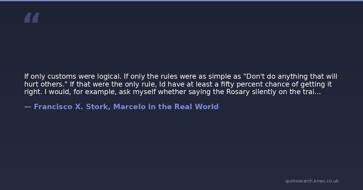 If only customs were logical. If only the rules were as simple as "Don't do anything that will hurt others." If that were the only rule, Id have at least a fifty percent chance of getting it right. I would, for example, ask myself whether saying the Rosary silently on the train would hurt others. The answer would be no and so I would say it. As it is, the reasons as to why something is right and something is not seem arbitrary.