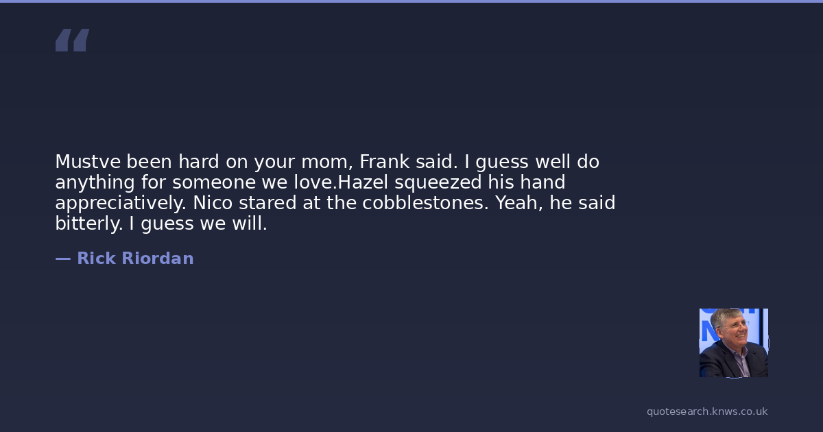 Mustve been hard on your mom, Frank said. I guess well do anything for someone we love.Hazel squeezed his hand appreciatively. Nico stared at the cobblestones. Yeah, he said bitterly. I guess we will.