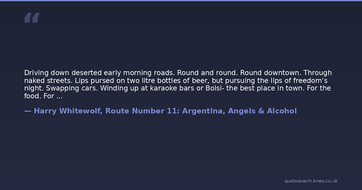 Driving down deserted early morning roads. Round and round. Round downtown. Through naked streets. Lips pursed on two litre bottles of beer, but pursuing the lips of freedom's night. Swapping cars. Winding up at karaoke bars or Bolsi- the best place in town. For the food. For the folk. For the service. For the crema de papaya. And for that late night dawn's whiskey coffee.