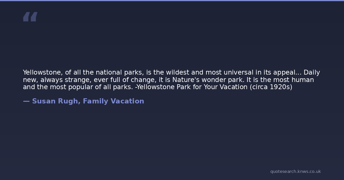 Yellowstone, of all the national parks, is the wildest and most universal in its appeal... Daily new, always strange, ever full of change, it is Nature's wonder park. It is the most human and the most popular of all parks. -Yellowstone Park for Your Vacation (circa 1920s)