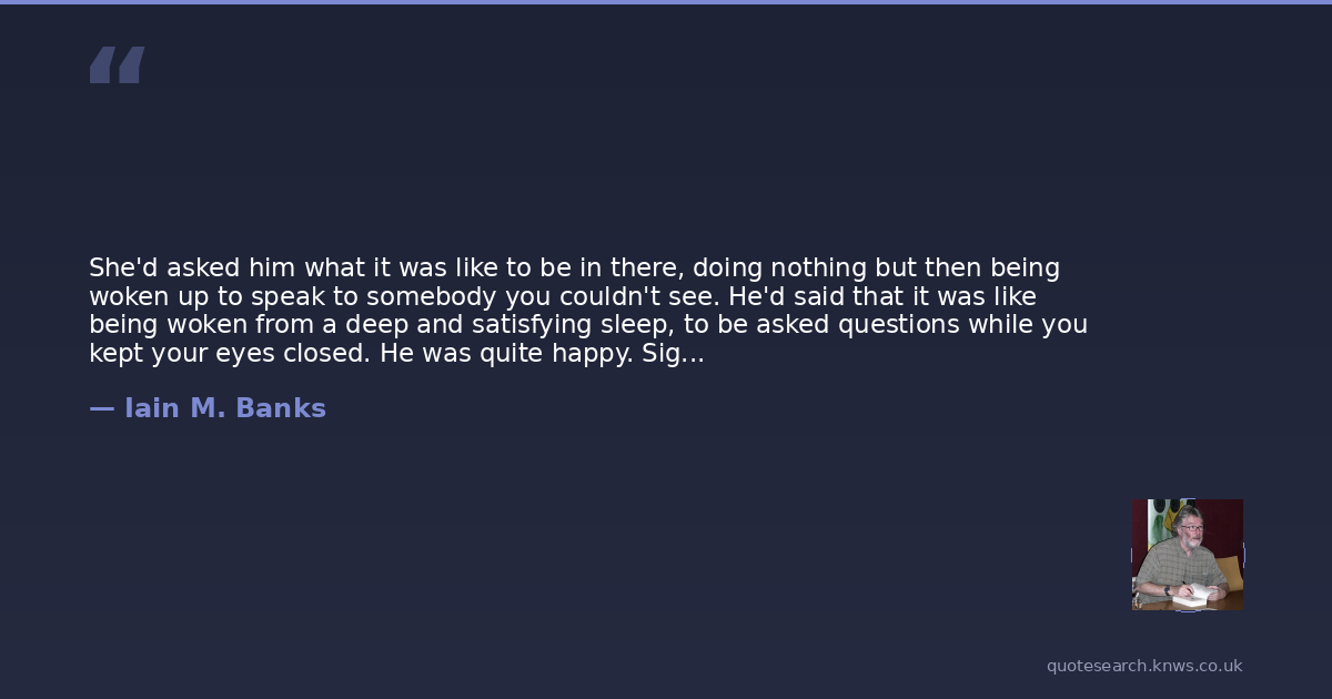 She'd asked him what it was like to be in there, doing nothing but then being woken up to speak to somebody you couldn't see. He'd said that it was like being woken from a deep and satisfying sleep, to be asked questions while you kept your eyes closed. He was quite happy. Sight was over-rated anyway.
