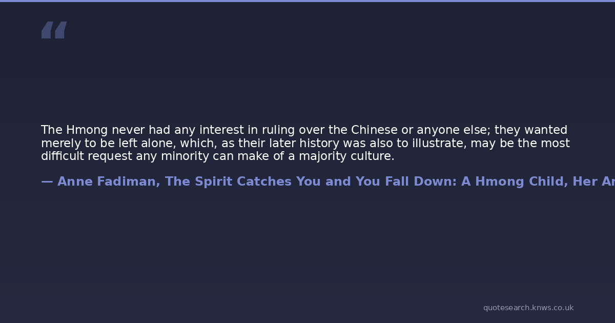The Hmong never had any interest in ruling over the Chinese or anyone else; they wanted merely to be left alone, which, as their later history was also to illustrate, may be the most difficult request any minority can make of a majority culture.