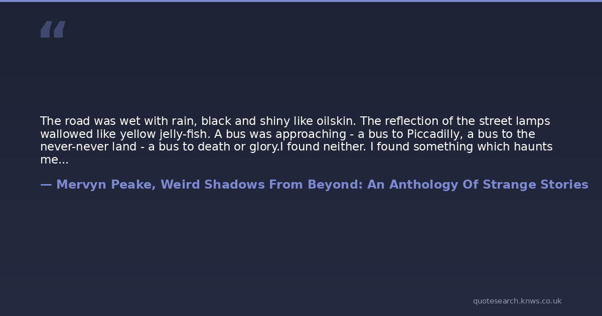 The road was wet with rain, black and shiny like oilskin. The reflection of the street lamps wallowed like yellow jelly-fish. A bus was approaching - a bus to Piccadilly, a bus to the never-never land - a bus to death or glory.I found neither. I found something which haunts me still.The great bus swayed as it sped. The black street gleamed. Through the window a hundred faces fluttered by as though the leaves of a dark book were being flicked over. And I sat there, with a sixpenny ticket in my hand. What was I doing! Where was I going?("Same Time, Same Place")