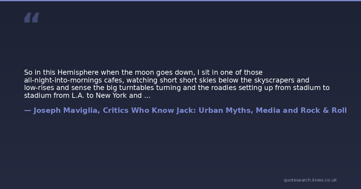 So in this Hemisphere when the moon goes down, I sit in one of those all-night-into-mornings cafes, watching short short skies below the skyscrapers and low-rises and sense the big turntables turning and the roadies setting up from stadium to stadium from L.A. to New York and all north and south and east and west and in between and i know there must be a lot of kids who aren't sleeping but listening to their muse iPad-ing and YouTubing...and the final shore ain't no shore at all but a long ether cable cyperspacing us together cutting the continent in half.