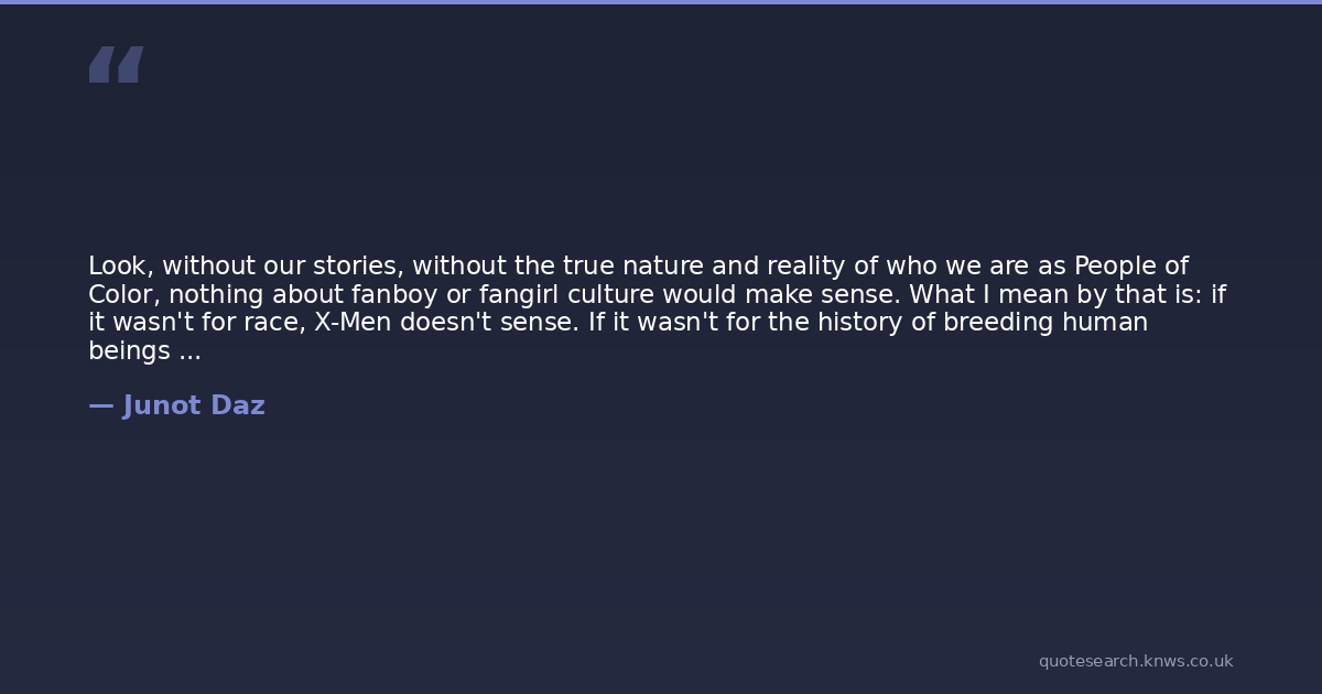 Look, without our stories, without the true nature and reality of who we are as People of Color, nothing about fanboy or fangirl culture would make sense. What I mean by that is: if it wasn't for race, X-Men doesn't sense. If it wasn't for the history of breeding human beings in the New World through chattel slavery, Dune doesn't make sense. If it wasn't for the history of colonialism and imperialism, Star Wars doesn't make sense. If it wasn't for the extermination of so many Indigenous First Nations, most of what we call science fictions contact stories doesn't make sense. Without us as the secret sauce, none of this works, and it is about time that we understood that we are the Force that holds the Star Wars universe together. Were the Prime Directive that makes Star Trek possible, yeah. In the Green Lantern Corps, we are the oath. We are all of these thingserased, and yet without uswe are essential.