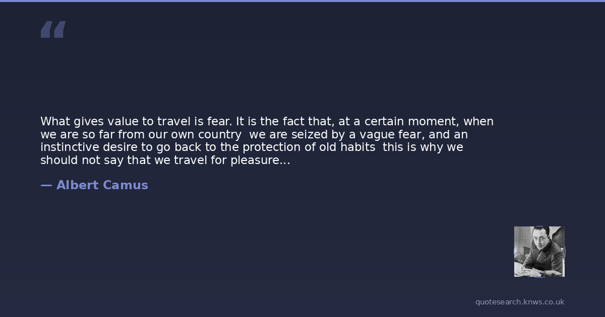 What gives value to travel is fear. It is the fact that, at a certain moment, when we are so far from our own country we are seized by a vague fear, and an instinctive desire to go back to the protection of old habits this is why we should not say that we travel for pleasure. There is no pleasure in traveling, and I look upon it more as an occasion for spiritual testing Pleasure takes us away from ourselves in the same way as distraction, in Pascals use of the word, takes us away from God. Travel, which is like a greater and a graver science, brings us back to ourselves.