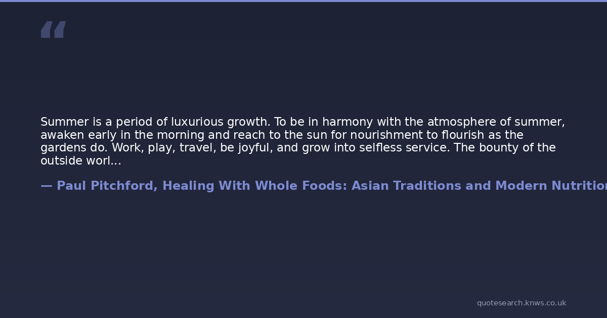 Summer is a period of luxurious growth. To be in harmony with the atmosphere of summer, awaken early in the morning and reach to the sun for nourishment to flourish as the gardens do. Work, play, travel, be joyful, and grow into selfless service. The bounty of the outside world enters and enlivens us.