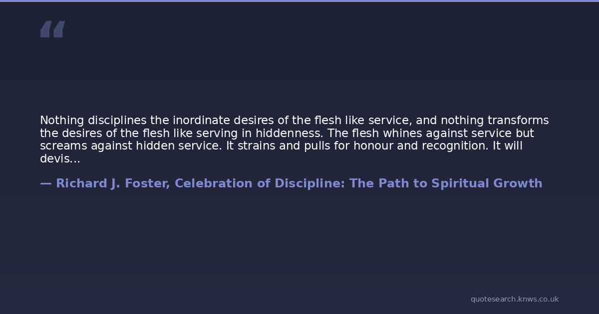 Nothing disciplines the inordinate desires of the flesh like service, and nothing transforms the desires of the flesh like serving in hiddenness. The flesh whines against service but screams against hidden service. It strains and pulls for honour and recognition. It will devise subtle, religiously acceptable means to call attention to the service rendered. If we stoutly refuse to give in to this lust of the flesh, we crucify it. Every time we crucify the flesh, we crucify our pride and arrogance.