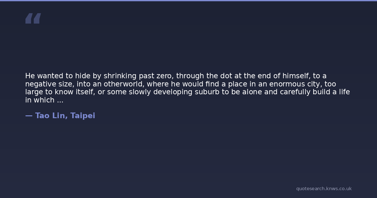 He wanted to hide by shrinking past zero, through the dot at the end of himself, to a negative size, into an otherworld, where he would find a place in an enormous city, too large to know itself, or some slowly developing suburb to be alone and carefully build a life in which he might be able to begin, at some point, to think about what to do about himself.