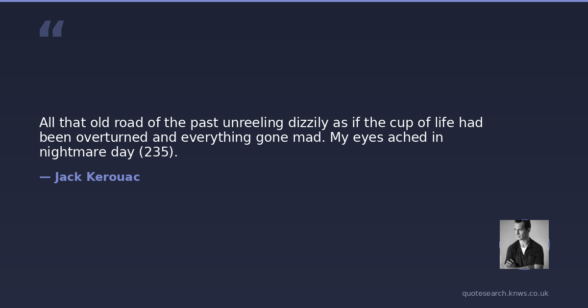 All that old road of the past unreeling dizzily as if the cup of life had been overturned and everything gone mad. My eyes ached in nightmare day (235).