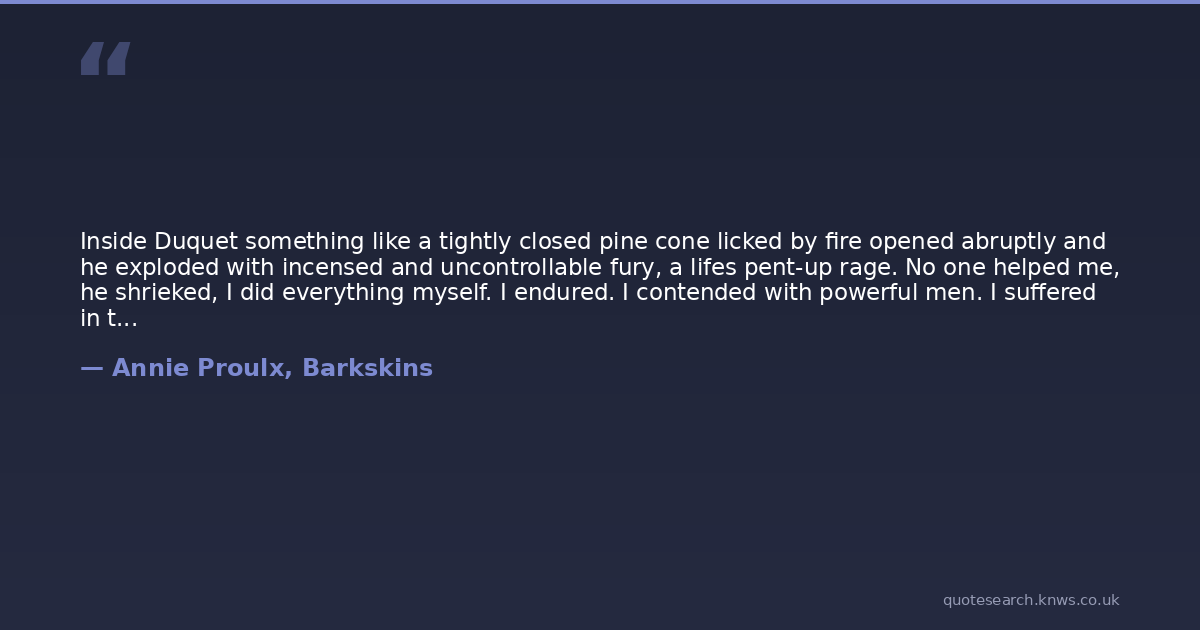 Inside Duquet something like a tightly closed pine cone licked by fire opened abruptly and he exploded with incensed and uncontrollable fury, a lifes pent-up rage. No one helped me, he shrieked, I did everything myself. I endured. I contended with powerful men. I suffered in the wilderness. I accepted the risk I might die. No one helped me! The boys gaze shifted, the fever-boiled eyes following Duquets rising arm closing only when the tomahawk split his brain.