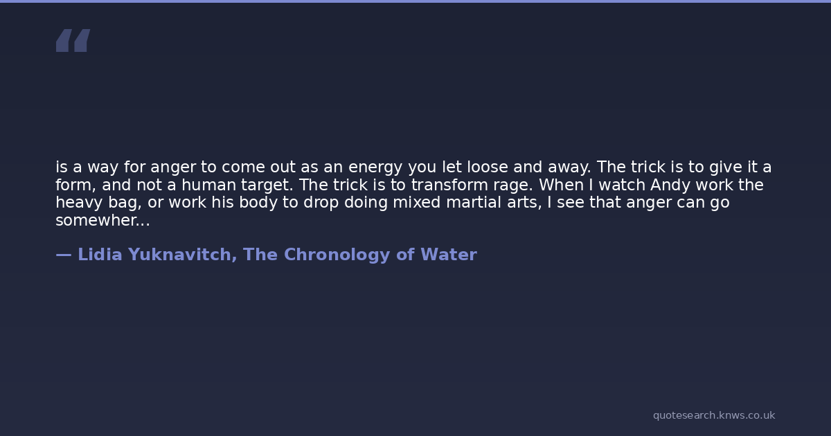 is a way for anger to come out as an energy you let loose and away. The trick is to give it a form, and not a human target. The trick is to transform rage. When I watch Andy work the heavy bag, or work his body to drop doing mixed martial arts, I see that anger can go somewhere - out and away from a body - like an energy let loose and given form. Like my junk comes out in art.