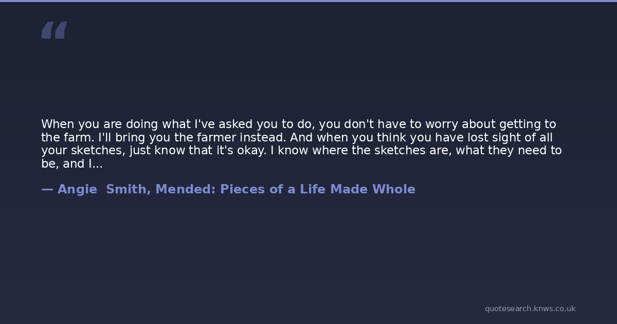 When you are doing what I've asked you to do, you don't have to worry about getting to the farm. I'll bring you the farmer instead. And when you think you have lost sight of all your sketches, just know that it's okay. I know where the sketches are, what they need to be, and I will never leave you.Let go of the grief and the sorrow. Release the anger and the plans set in stone. Because I hold your sketch in My hand the way Mr. Gentry did in his. I watch and I draw - even when you don't know. I am concerned with all things that concern you.