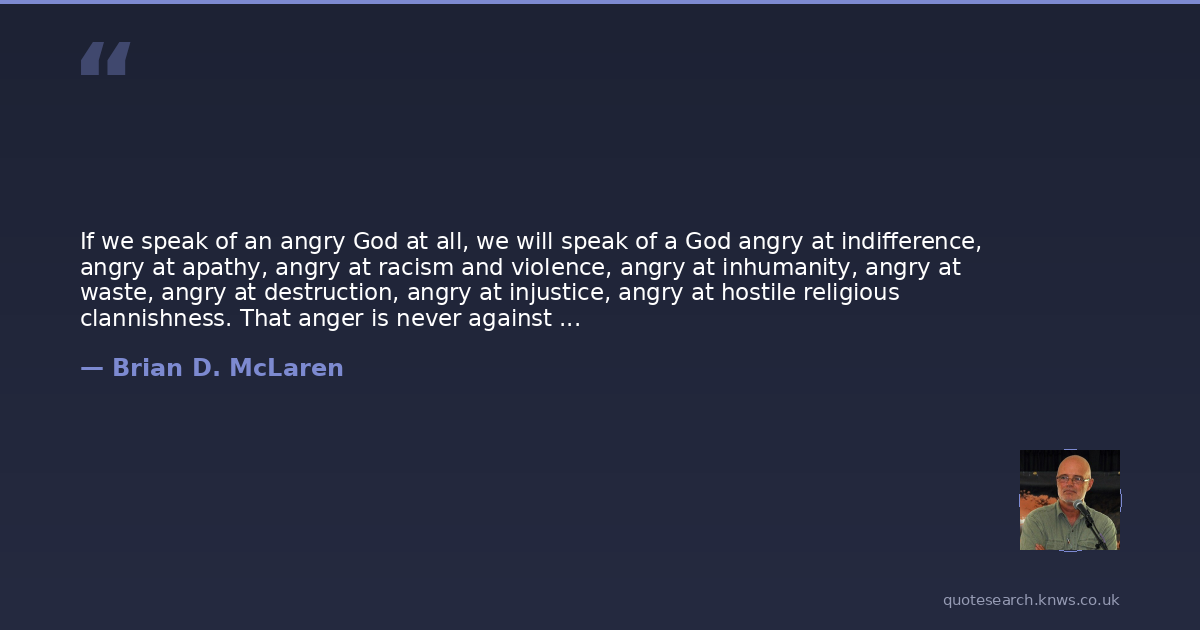 If we speak of an angry God at all, we will speak of a God angry at indifference, angry at apathy, angry at racism and violence, angry at inhumanity, angry at waste, angry at destruction, angry at injustice, angry at hostile religious clannishness. That anger is never against us (or them); it is against what is against us (and them).