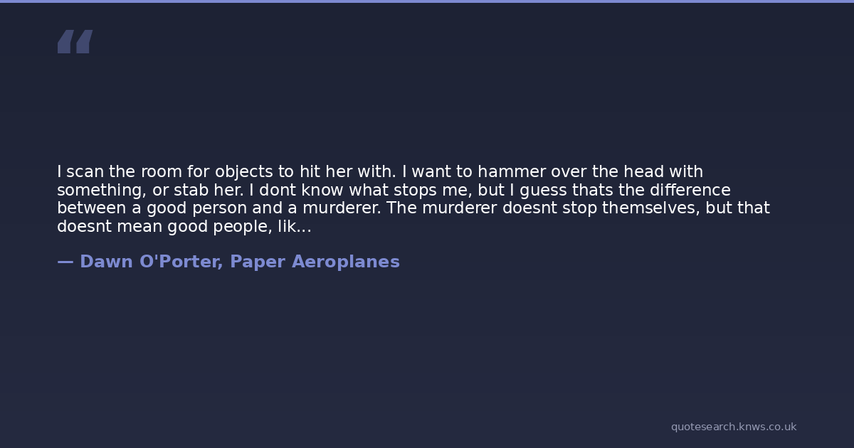 I scan the room for objects to hit her with. I want to hammer over the head with something, or stab her. I dont know what stops me, but I guess thats the difference between a good person and a murderer. The murderer doesnt stop themselves, but that doesnt mean good people, like me, dont have the same thoughts sometimes.