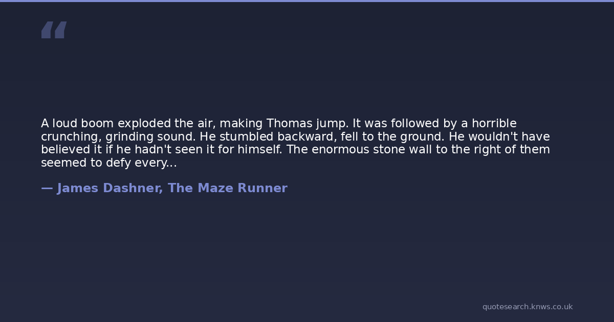 A loud boom exploded the air, making Thomas jump. It was followed by a horrible crunching, grinding sound. He stumbled backward, fell to the ground. He wouldn't have believed it if he hadn't seen it for himself. The enormous stone wall to the right of them seemed to defy every known law of physics as it slid along the ground, throwing sparks and dust as it moved, rock against rock. The crunching sound rattled his bones. He looked around at the other openings. On all four sides of the Glade, the right walls were moving toward the left, closing the gap of the Doors. Then one final boom rumbled across the Glade as all four Doors sealed shut for the night.