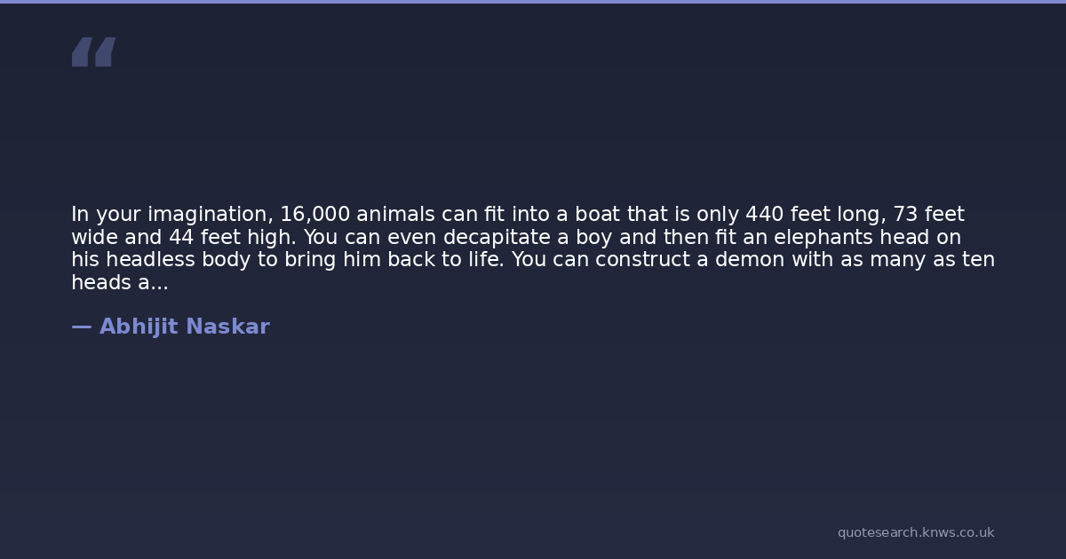In your imagination, 16,000 animals can fit into a boat that is only 440 feet long, 73 feet wide and 44 feet high. You can even decapitate a boy and then fit an elephants head on his headless body to bring him back to life. You can construct a demon with as many as ten heads and conceive him to be immortal unless he is hit at his navel. As far as your imagination is concerned, there is no boundary to perception.
