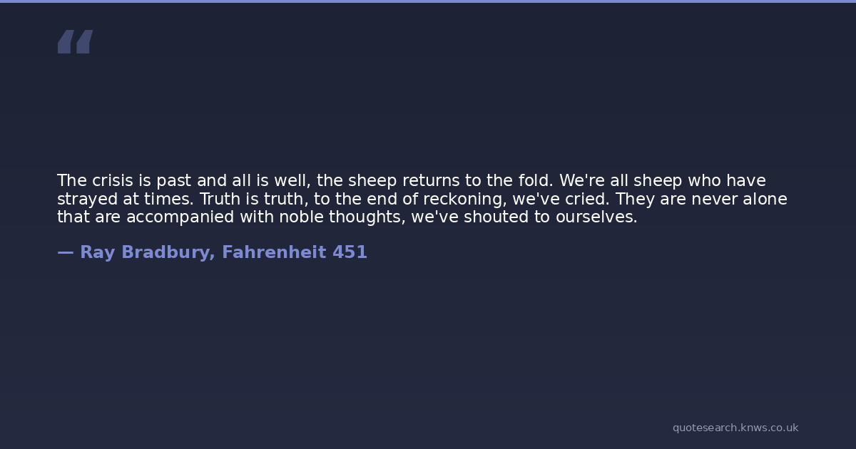 The crisis is past and all is well, the sheep returns to the fold. We're all sheep who have strayed at times. Truth is truth, to the end of reckoning, we've cried. They are never alone that are accompanied with noble thoughts, we've shouted to ourselves.