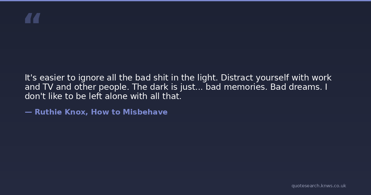 It's easier to ignore all the bad shit in the light. Distract yourself with work and TV and other people. The dark is just... bad memories. Bad dreams. I don't like to be left alone with all that.