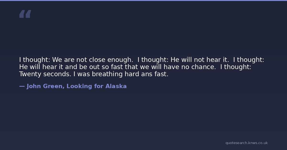 I thought: We are not close enough. I thought: He will not hear it. I thought: He will hear it and be out so fast that we will have no chance. I thought: Twenty seconds. I was breathing hard ans fast.