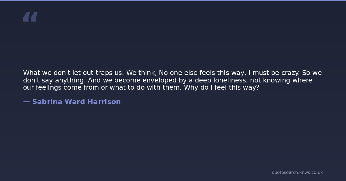 What we don't let out traps us. We think, No one else feels this way, I must be crazy. So we don't say anything. And we become enveloped by a deep loneliness, not knowing where our feelings come from or what to do with them. Why do I feel this way?